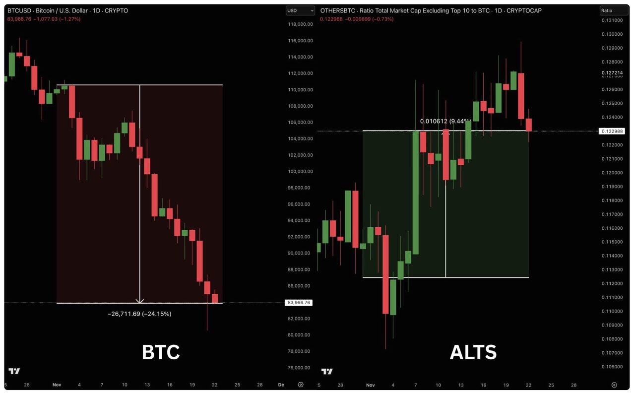 Nhà phân tích tiền điện tử Bull Theory đã nhấn mạnh một sự thay đổi lớn đang diễn ra âm thầm trên biểu đồ. Trong khi Bitcoin đã giảm hơn 24% trong tháng 11, tỷ lệ ALT/BTC đã tăng gần 9,5%.