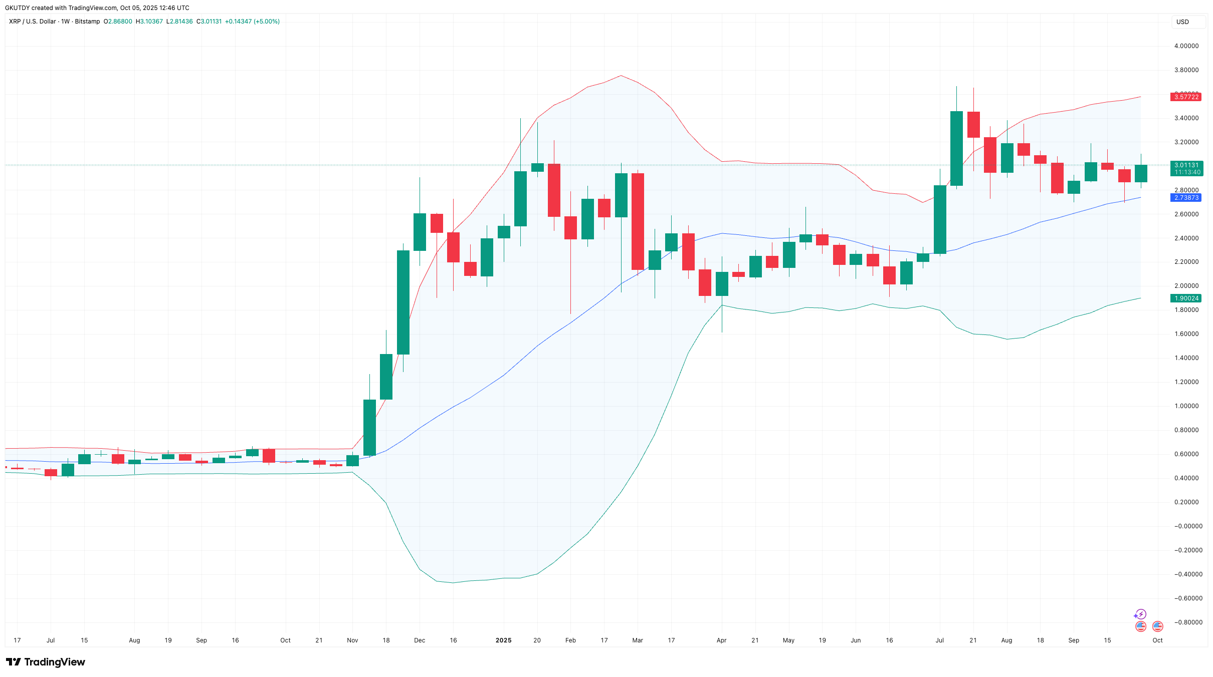 Hiện dải trên ở mức 3,57 USD và dải dưới ở 1,90 USD. Lần gần nhất hiện tượng tương tự xuất hiện là đầu năm nay, khi XRP tăng từ 0,60 USD lên hơn 3,50 USD chỉ trong ba tháng.