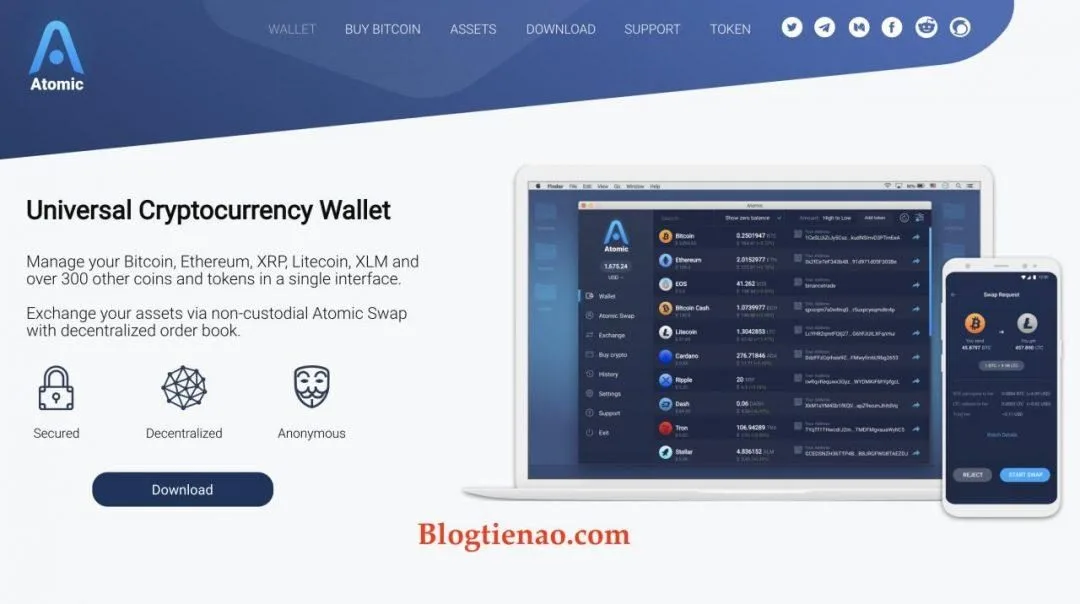 Cũng như các loại ví tiền điện tử khác, Atomic Wallet cho phép bạn lưu trữ Bitcoin, Ethereum, Bitcoin Cash, Ripple, Litecoin, Tron,….Và hơn 300 các loại Coin/Token khác nhau mà không hề mất bất kỳ chi phí nào. Nên có thể nói nó là ví tiện lợi nhất nếu bạn có ý định trữ nhiều coin. Giao diện thì rất thân thiện với người dùng, đơn giản, bắt mắt, dễ nhìn. Trong khi độ bảo mật thì khá an toàn, Blogtienao sẽ có ghi chú về bảo mật khi tiến hành chỉ các bạn cài đặt và sử dụng.