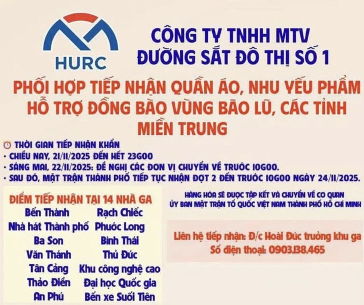 Ngoài ra, mọi người có thể quyên góp bằng hiện vật, nhu yếu phẩm, quần áo…tại 14 nhà ga nhận cứu trợ người dân các tỉnh miền Trung.