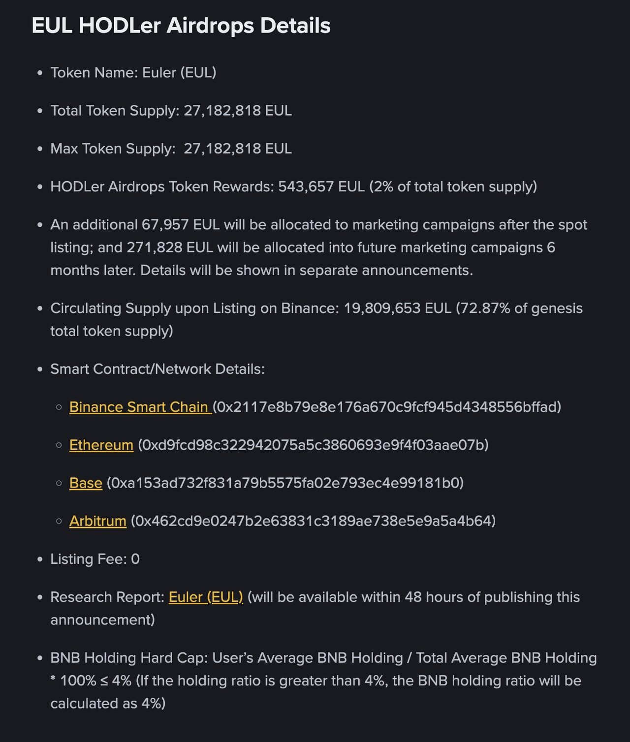 Binance thông báo dự án thứ 51 trên HODLer Airdrop – Euler (EUL), một super app DeFi kết hợp lending và trading bất kỳ tài sản nào làm tài sản thế chấp, thị trường tùy chỉnh và thanh khoản sâu.