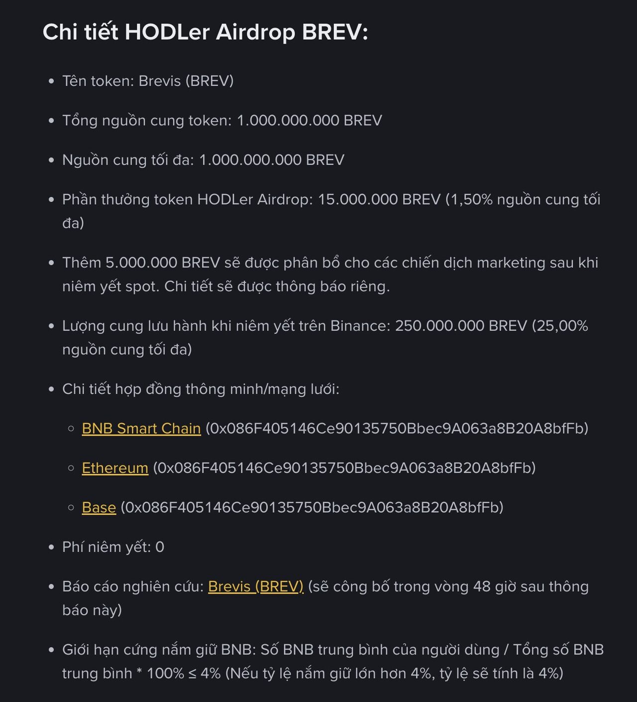 Binance sẽ niêm yết BREV vào lúc 21:00 ngày 6 tháng 1 năm 2026 (Giờ Việt Nam) và mở giao dịch với các cặp USDT, USDC, BNB và TRY.