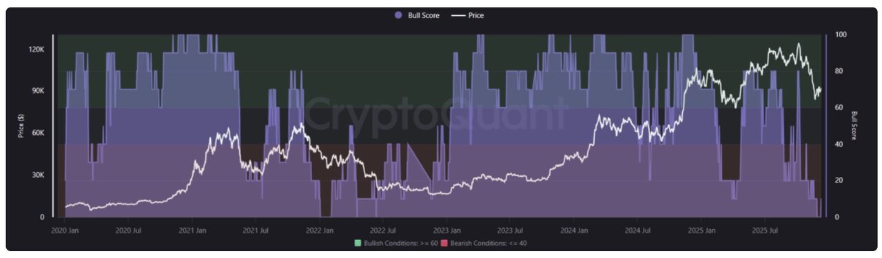 Dữ liệu trên chuỗi cho thấy áp lực đang gia tăng. Dữ liệu của Cryptoquant cho thấy Điểm số Tăng giá Bitcoin đã giảm xuống 0, cho thấy tâm lý giảm giá cực độ.