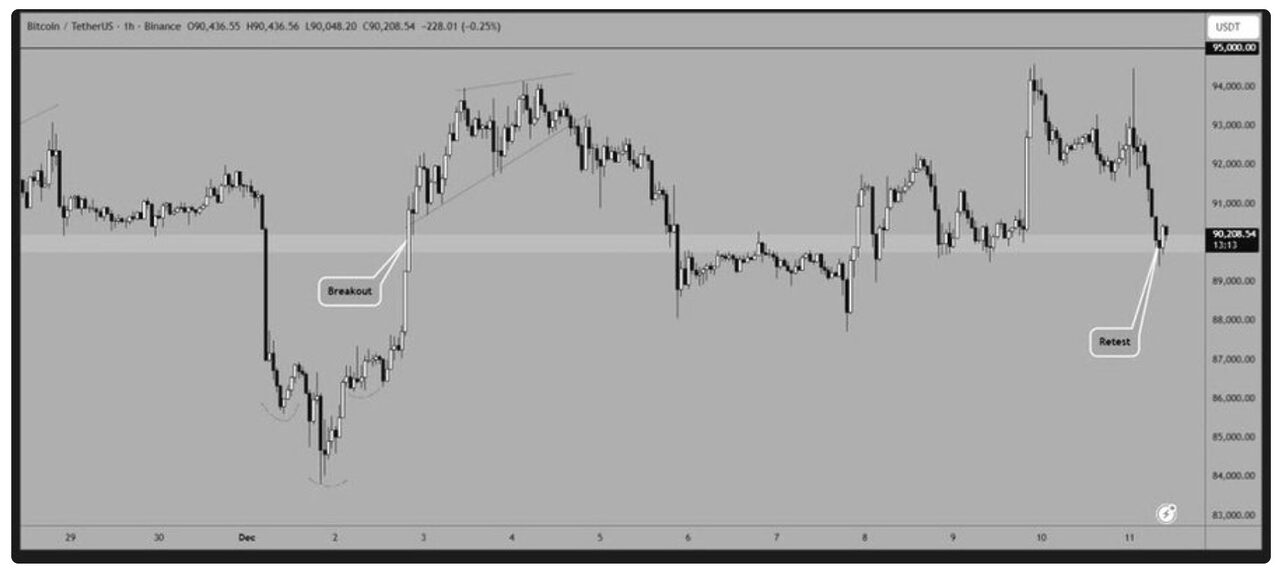 Hiện tại, BTC đang kiểm tra lại vùng giá 90.000 đô la, mức giá đã trở thành một ngưỡng hỗ trợ ngắn hạn quan trọng.
