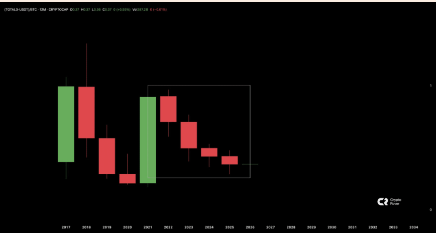 Một tín hiệu đáng chú ý nằm ở TOTAL3 – chỉ số đại diện cho vốn hóa thị trường altcoin (không bao gồm Bitcoin và Ethereum). Chỉ số này đã ghi nhận năm thứ tư liên tiếp giảm giá so với Bitcoin, cho thấy “mùa altcoin” đã suy yếu dần trong nhiều năm qua.