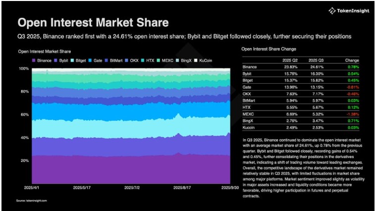 Thị trường phái sinh nhìn chung duy trì sự ổn định, với những biến động nhỏ về thị phần. Tâm lý nhà đầu tư cải thiện, biên độ biến động tài sản tăng cùng điều kiện thanh khoản thuận lợi hơn đã thúc đẩy mức độ tham gia mạnh mẽ hơn vào các hợp đồng tương lai và hợp đồng vĩnh viễn (futures & perpetuals).