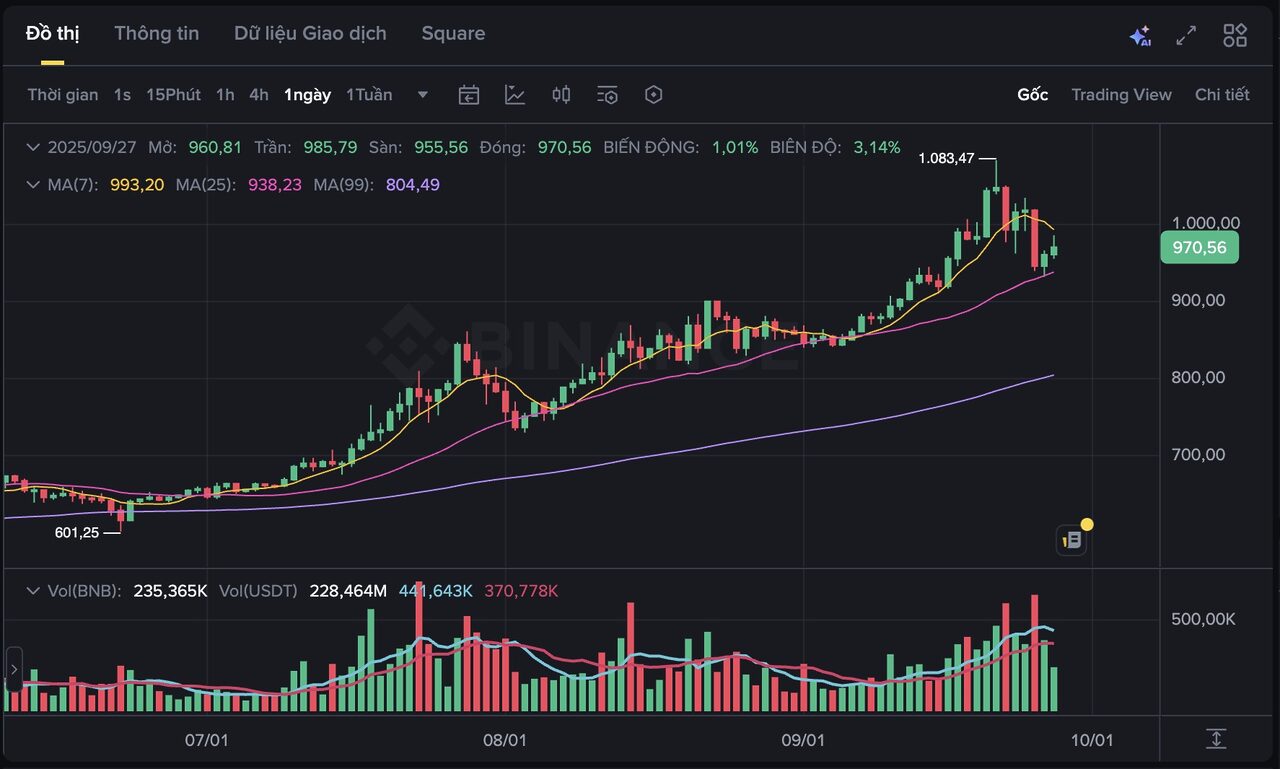 Các nhà phân tích nhấn mạnh rằng thương vụ mua lại trị giá 90 triệu USD của Nano Labs, kết hợp với khối lượng giao dịch tăng và đường trung bình động cao hơn, đang thúc đẩy đà tăng tiếp theo. Với việc BNB hiện đang giao dịch quanh mức 970 USD, những nhà đầu tư đang theo dõi sát sao ngưỡng tâm lý 1.000 USD và các ngưỡng Fibonacci mở rộng là các ngưỡng kháng cự quan trọng tiếp theo.