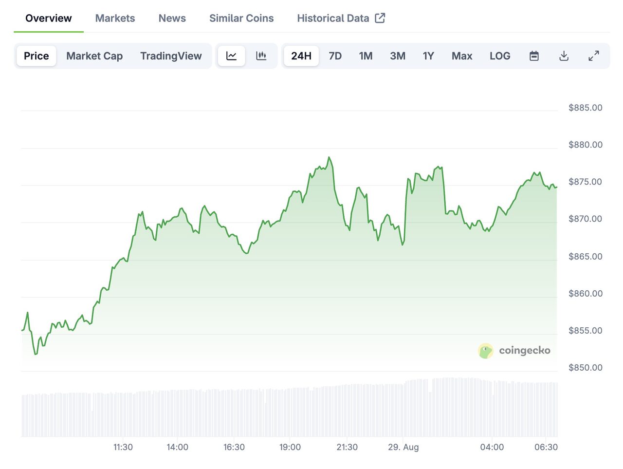 Giá Binance Coin (BNB) đã có sự phục hồi sau thông tin về đơn xin ETF staking BNB của REX-Osprey. Giá BNB đã tăng 2,5% từ mức thấp nhất trong ngày hôm nay, lên khoảng 875 đô la tại thời điểm viết bài.