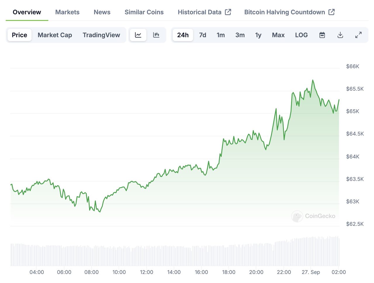 Bitcoin đã nhanh chóng quay trở lại mức 65.000 USD. Đà tăng giá của Bitcoin giúp toàn thị trường giao dịch trong sắc xanh.