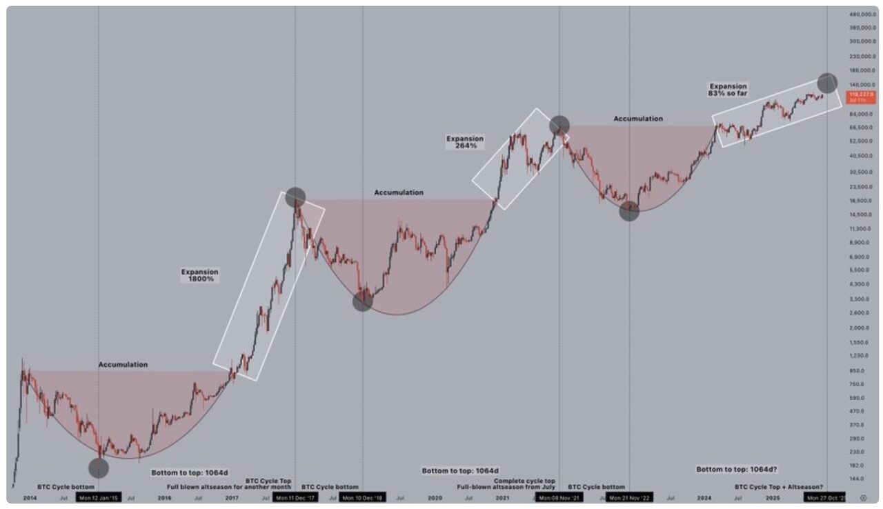Chu kỳ hiện tại bắt đầu sau khi Bitcoin giảm xuống dưới 16.000 đô la vào tháng 11 năm 2022. Kể từ đó, BTC đã phục hồi mạnh mẽ, tăng hơn 83% và gần đây giao dịch trên 120.000 đô la.