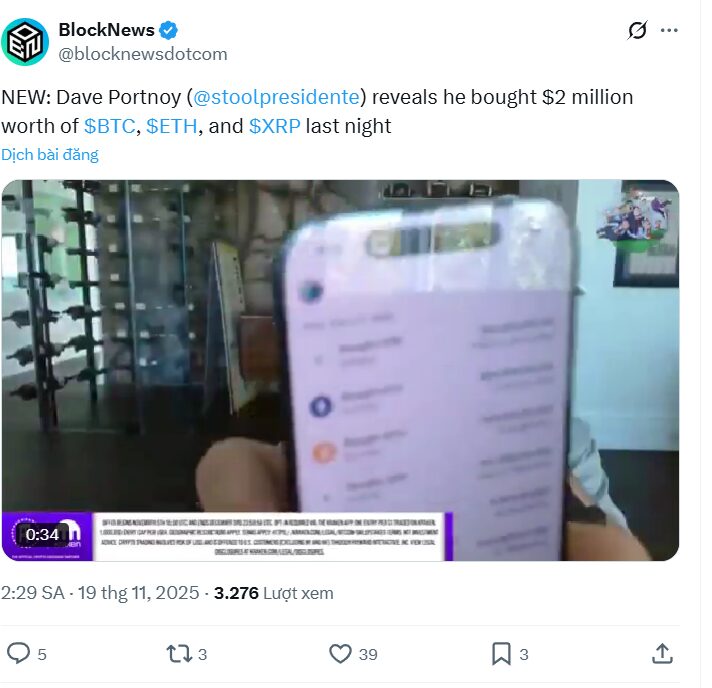 Theo ảnh chụp màn hình được Portnoy chia sẻ, ông đã mua 1 triệu USD XRP, 750.000 USD Bitcoin và 400.000 USD Ethereum.