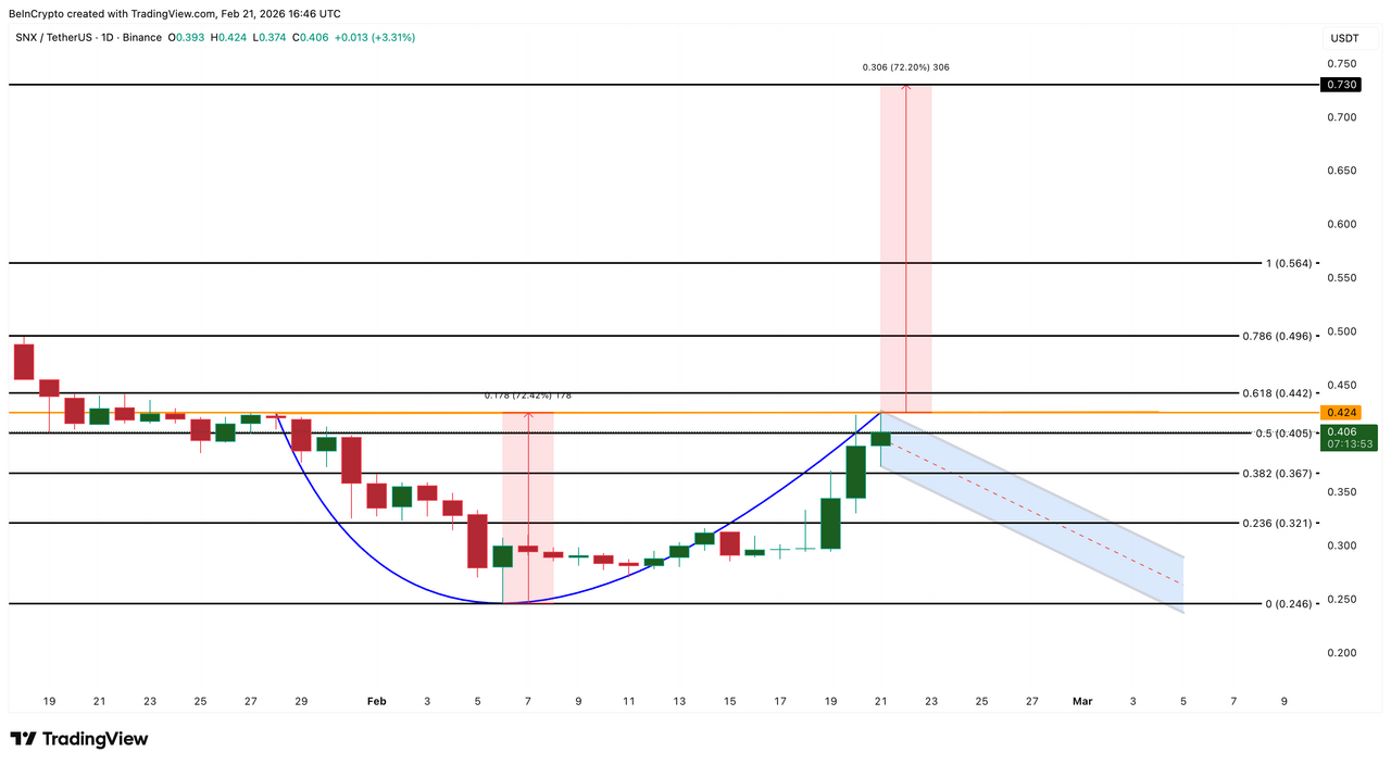 Trong khi đó, Synthetix (SNX) cho thấy nhóm 100 ví lớn nhất tăng mạnh lượng nắm giữ. SNX đang xây dựng mô hình “cốc tay cầm”, với mốc 0,42 USD là điểm xác nhận breakout.
