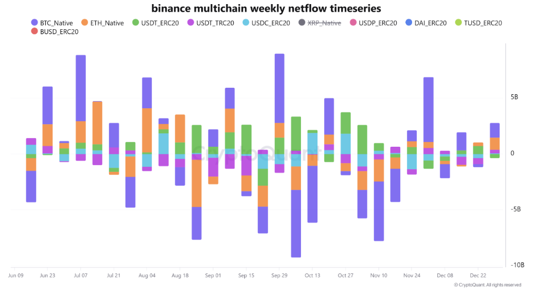 Theo báo cáo on-chain mới nhất từ CryptoQuant, trong tuần bắt đầu từ ngày 29/12/2025, Binance ghi nhận dòng tiền ròng vào khoảng 2,44 tỷ USD. Đây là mức inflow cao nhất trong hơn một tháng qua và phần lớn đến từ các ví có lượng tài sản lớn.