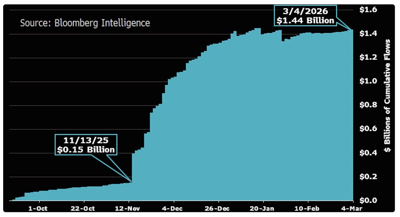Tính đến đầu tháng 3 năm 2026, tổng dòng vốn đổ vào các sản phẩm ETF XRP đã đạt khoảng 1,44 tỷ đô la. Dữ liệu cũng cho thấy các nhà đầu tư đã bổ sung thêm khoảng 58 triệu đô la trong tháng 2, bất chấp hoạt động giao dịch chậm lại trên thị trường tiền điện tử nói chung.