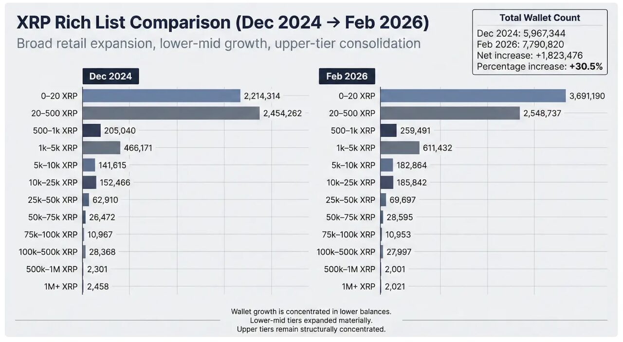 Từ tháng 12 năm 2024 đến tháng 2 năm 2026, tổng số ví XRP đã tăng từ 5,97 triệu lên 7,79 triệu, đánh dấu mức tăng gần 30%.