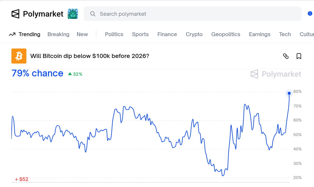 Sau đợt sụt giảm mạnh gần đây, nền tảng dự đoán Polymarket đã cập nhật dữ liệu cho thấy khả năng Bitcoin giảm xuống dưới 100.000 USD trước cuối năm 2025 đã tăng lên 79%.