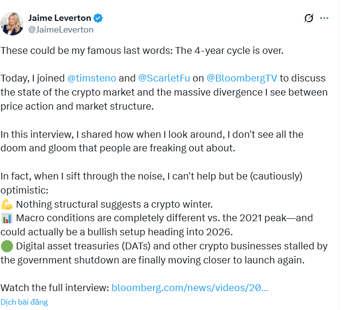 Chuyên gia Jaime Leverton: Crypto biến động mạnh nhưng chưa có dấu hiệu bước vào chu kỳ giảm sâu