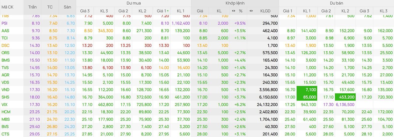 Nhiều mã nổi bật như VIX, TCX tăng kịch trần, trong khi các cổ phiếu khác như VPX (+4,4%), VND (+3,7%), SSI (+2,6%), MBS (+2,4%) cũng đồng loạt bứt phá.