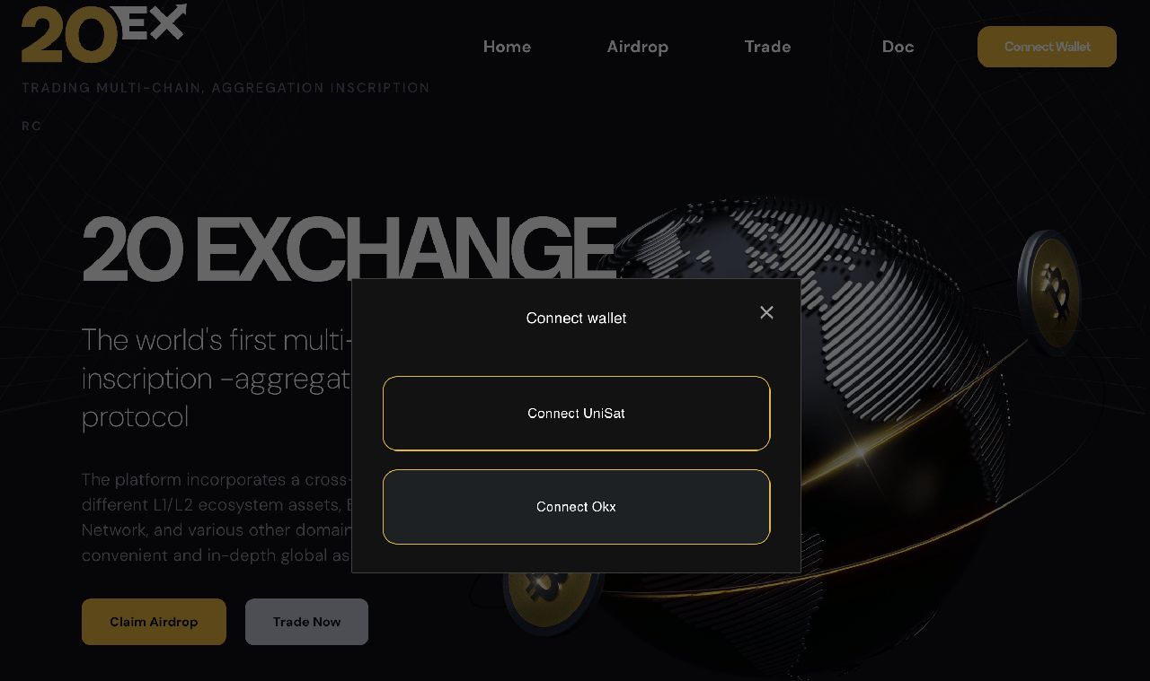 Do 20Exchange hiện chỉ mới cho phép sử dụng một trong 2 ví là Unissat hoặc OKX Wallet, nên bạn cần có sẵn một trong 2 ví này để kết nối