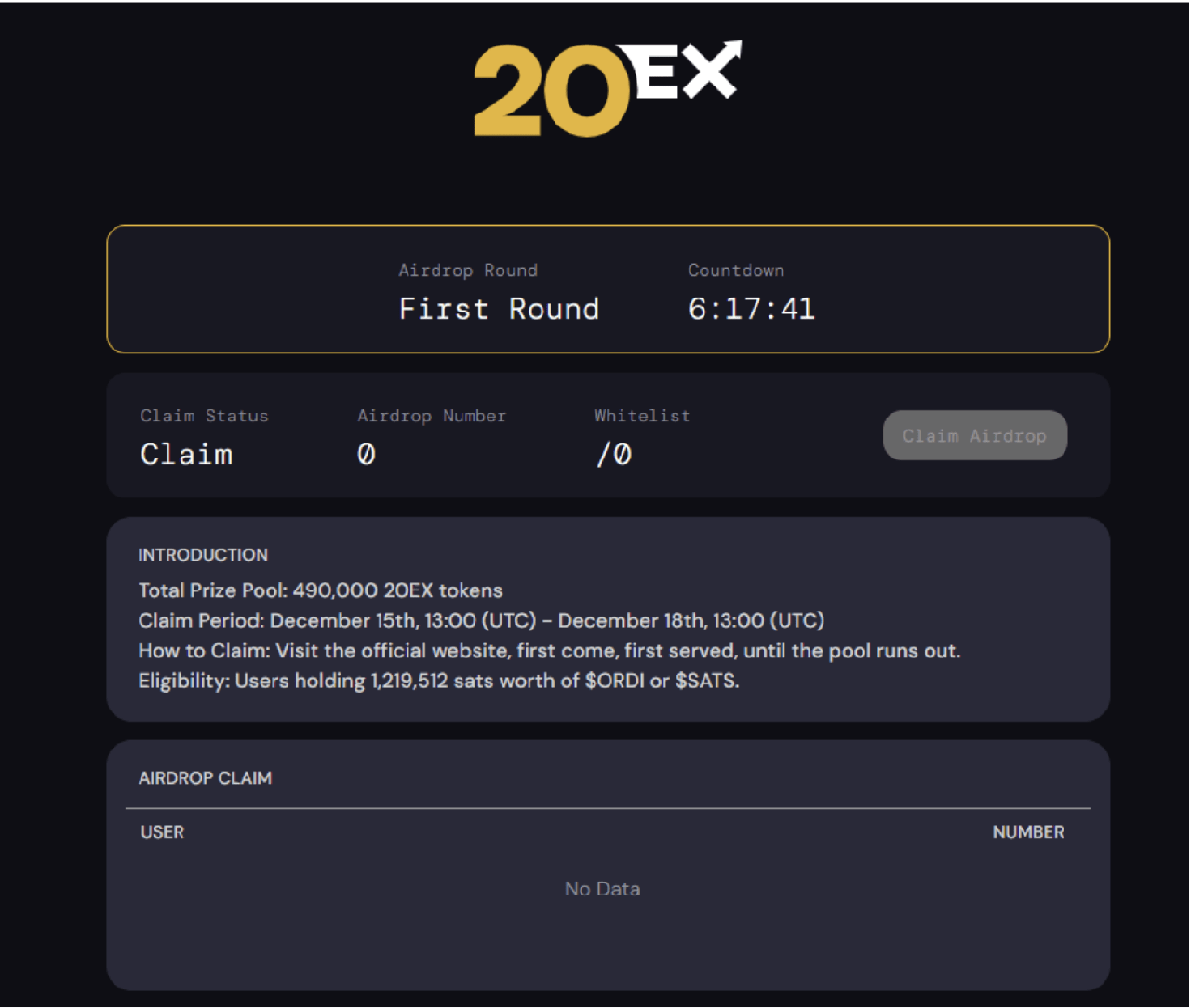 Cụ thể, holder ORDI và SATS có thể yêu cầu airdrop trên trang web 20EX. Trong mỗi vòng, tổng cộng 2.000 địa chỉ có thể yêu cầu airdrop trên cơ sở ai đến trước được phục vụ trước, miễn là đáp ứng yêu cầu snapshots.