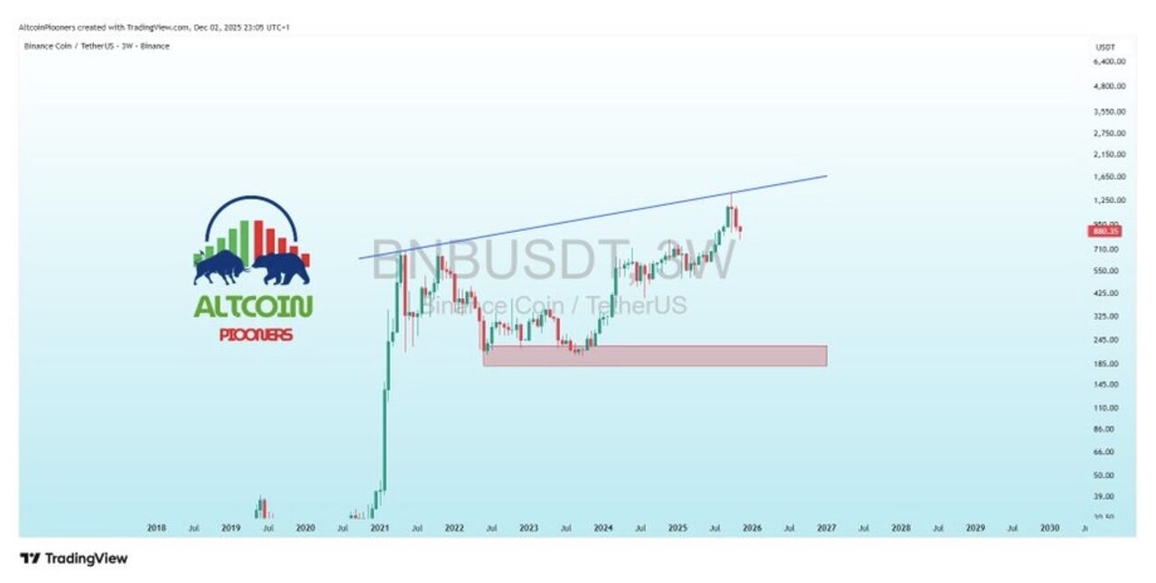 Nếu BNB vượt qua kênh với khối lượng giao dịch lớn, các nhà phân tích tin rằng đồng tiền này có thể bắt đầu một đợt tăng giá mạnh mẽ qua nhiều giai đoạn. Mục tiêu đầu tiên nằm trong khoảng 950–1.000 đô la, dựa trên cấu trúc giá gần đây.