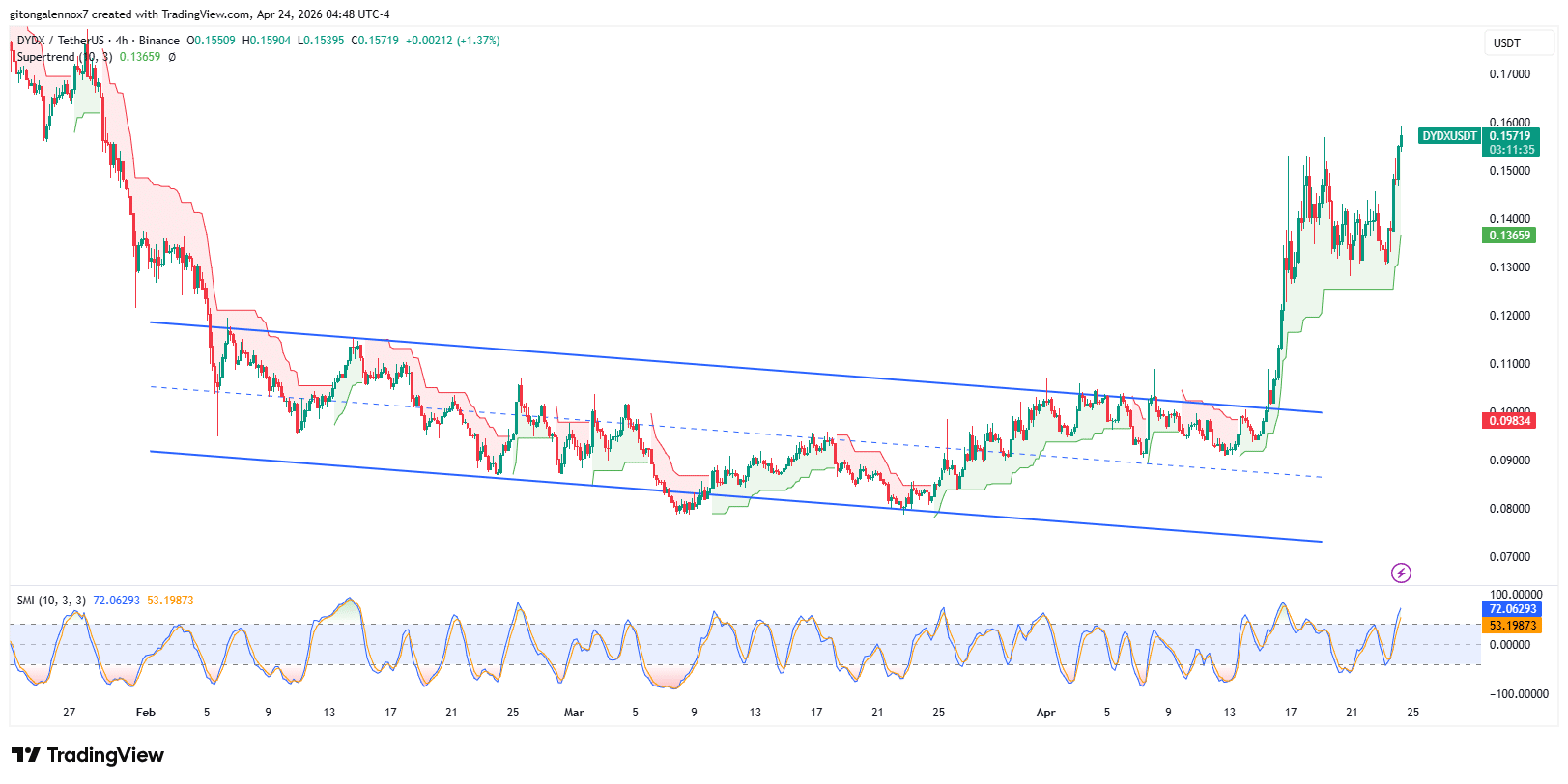 Trên biểu đồ, DYDX đã phá vỡ vùng tích lũy kéo dài hơn 10 ngày (0,1279 – 0,1530 USD) và tiến sát mốc kháng cự 0,16 USD. Các chỉ báo kỹ thuật như SuperTrend và SMI (71,6 – vùng quá mua) cho thấy phe mua đang chiếm ưu thế. Nếu vượt thành công, mục tiêu tiếp theo có thể là 0,18 USD.
