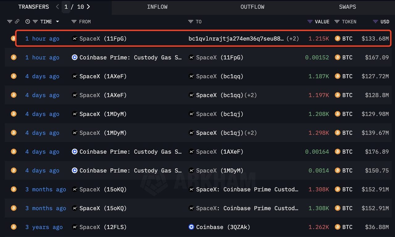 Theo dữ liệu từ Arkham Intelligence, SpaceX – công ty thám hiểm không gian của Elon Musk – vừa chuyển khoảng 1.215 BTC (tương đương 133,7 triệu USD) sang hai ví mới.