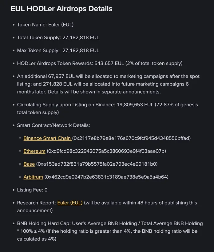 Binance thông báo dự án thứ 51 trên HODLer Airdrop – Euler (EUL)