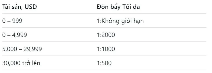 Đòn bẩy sau đó sẽ giảm khi số tiền gửi cao hơn. Ngoài ra, một số tài sản riêng biệt nhất định sẽ có nhiều mức đòn bẩy khác nhau, bao gồm:
