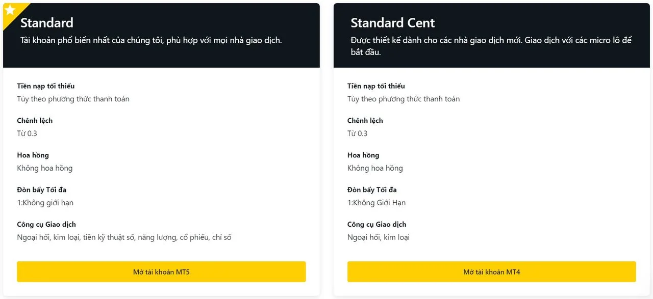 Tài khoản tiêu chuẩn – Standard và Standard Cent