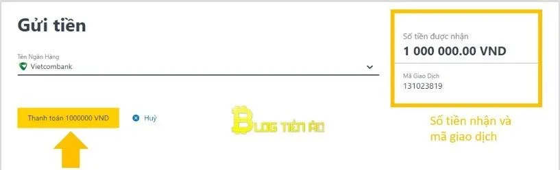 Như mình thì chọn ngân hàng Vietcombank và phần bên phải có số tiền được nhận và mã giao dịch. Hoàn tất bước chọn tên thì chọn “Thanh toán”