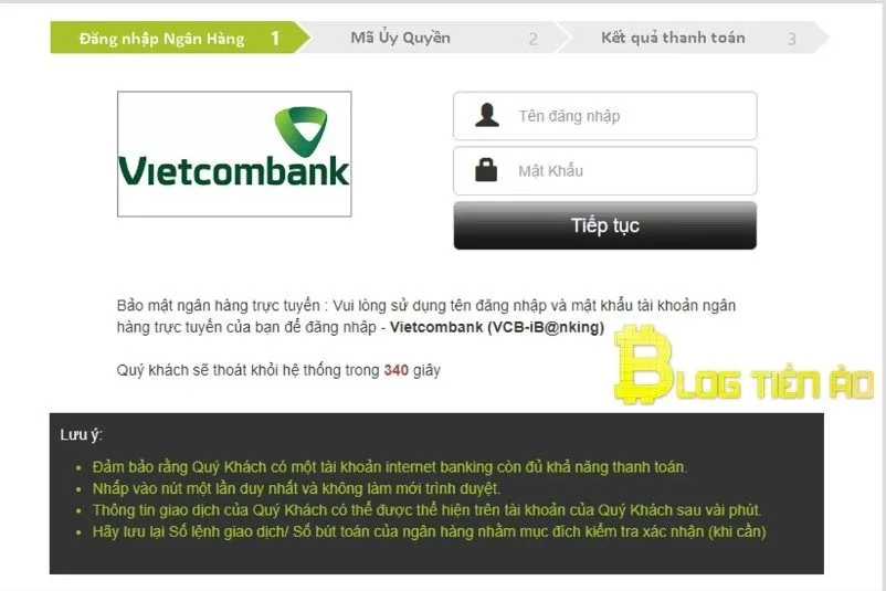 Bước 4: Đến bước này thì đã quá dễ dàng với anh em đã xài internet banking. Nhưng mình cũng nhắc lại luôn, chỉ cần thao tác như sau: Đăng nhập tài khoản ngân hàng, mã ủy quyền, Kết thúc thanh toán.