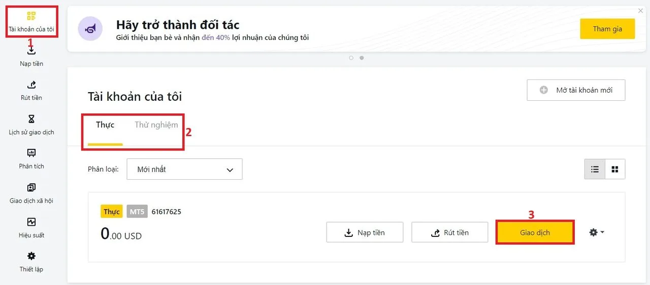 Bước 1: Tại “Tài khoản của tôi” (1) => chọn “Thực” (2) => tab “Giao dịch“ (3). Muốn trade thử nghiệm thì bạn cũng chọn tab giao dịch nhưng ở mục “Thử nghiệm”.