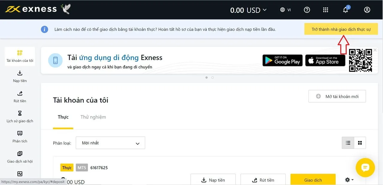 Bước 1: Sau khi đăng ký thành công, bạn sẽ được chuyển hướng đến trang “tài khoản của tôi”. Tại đây chọn “Trở thành nhà giao dịch thực sự”.