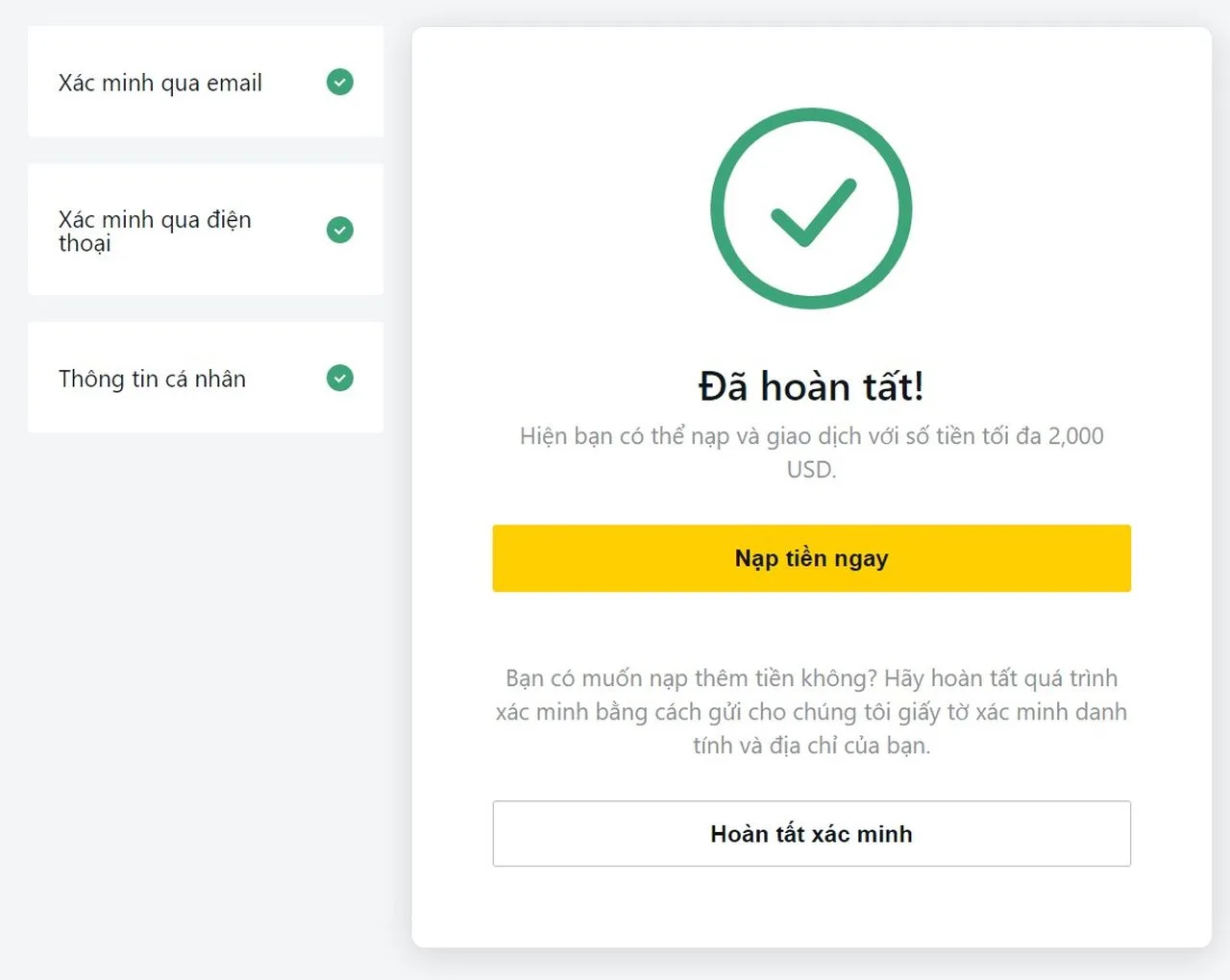 Các bước trên chỉ là hoàn thành bước xác minh cơ bản, bạn cần tiếp tục xác minh nâng cao để phá bỏ các giới hạn trong nạp – rút tiền.