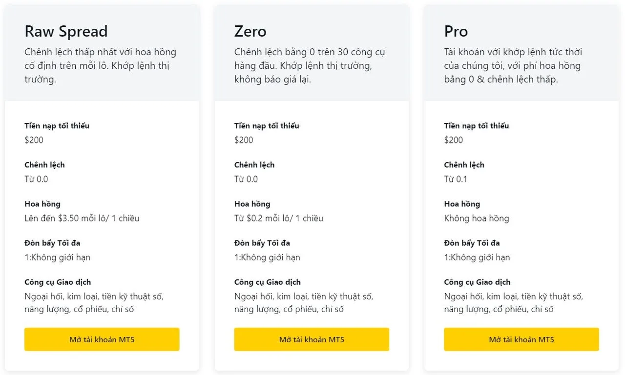 Nền tảng hiện có tất cả 5 tài khoản khác nhau chia thành 2 loại chính gồm tài khoản tiêu chuẩn (Standard và Standard Cent); tài khoản chuyên nghiệp (Raw Spread, Zero và Pro).