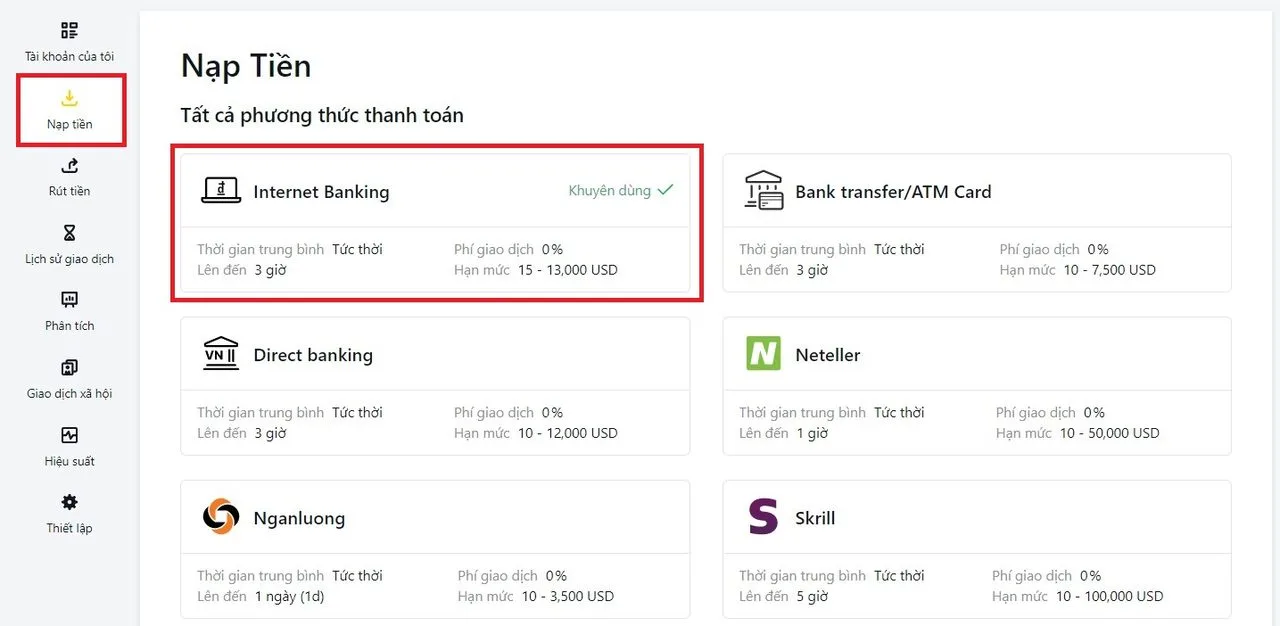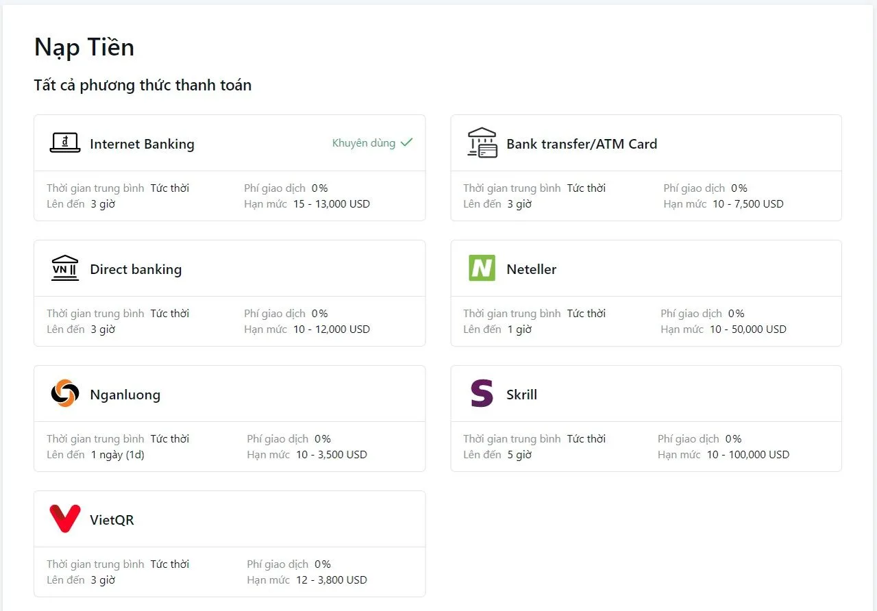 Bên cạnh đó, sàn còn hỗ trợ khách hàng nhiều phương thức thanh toán để khách hàng có thể dễ dàng nạp – rút. Các phương thức này gồm: