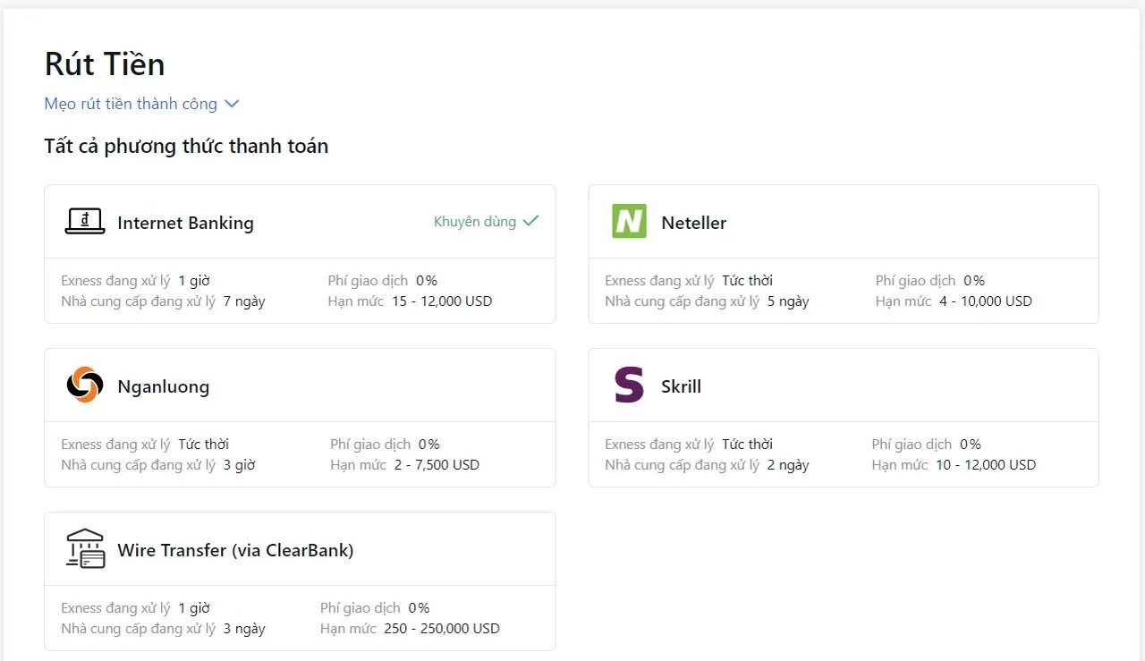Bạn có thể tham khảo mức nạp – rút tối thiểu cho từng hình thức https://www.exness.com/vi/deposits-and-withdrawals/.