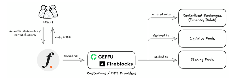 Người dùng gửi tài sản (stablecoin hoặc non-stablecoin) vào Falcon để đúc USDf. Tài sản được lưu ký bởi bên thứ ba qua multi-sig/MPC, đảm bảo không cá nhân nào tự ý rút.