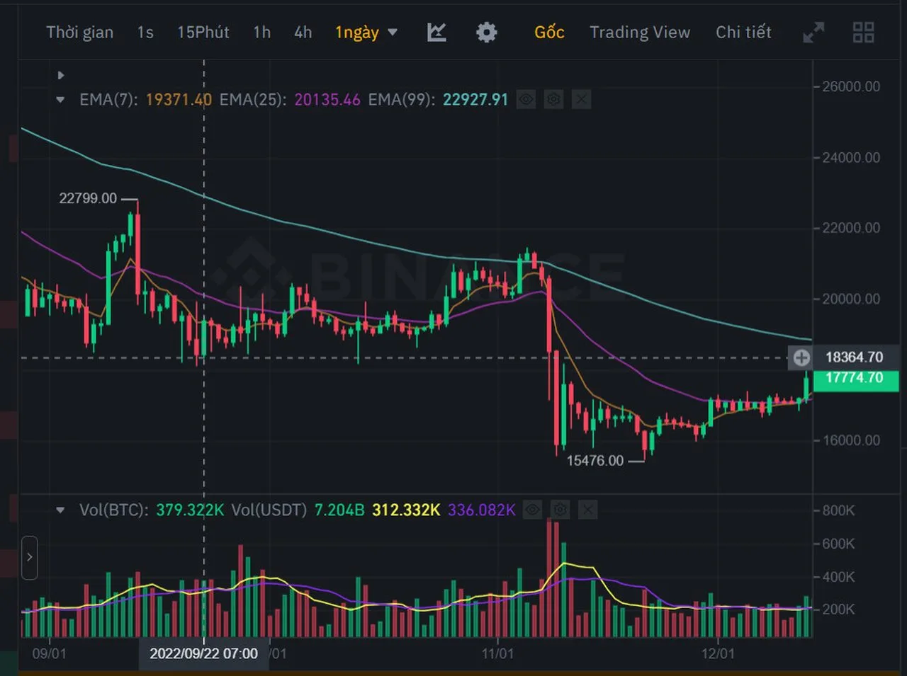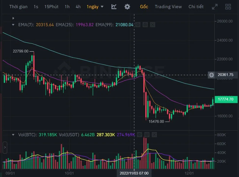 Và giống như những lần trước đó, giá BTC tiếp tục có biến động mạnh và tăng lên trên 21000 USD từ vùng 20000 USD, tuy nhiên vào đầu tháng 11 Bitcoin đã có sự sụt giảm mạnh và rơi về vùng 15476 USD và đây là mức đáy của Bitcoin trong năm 2022.