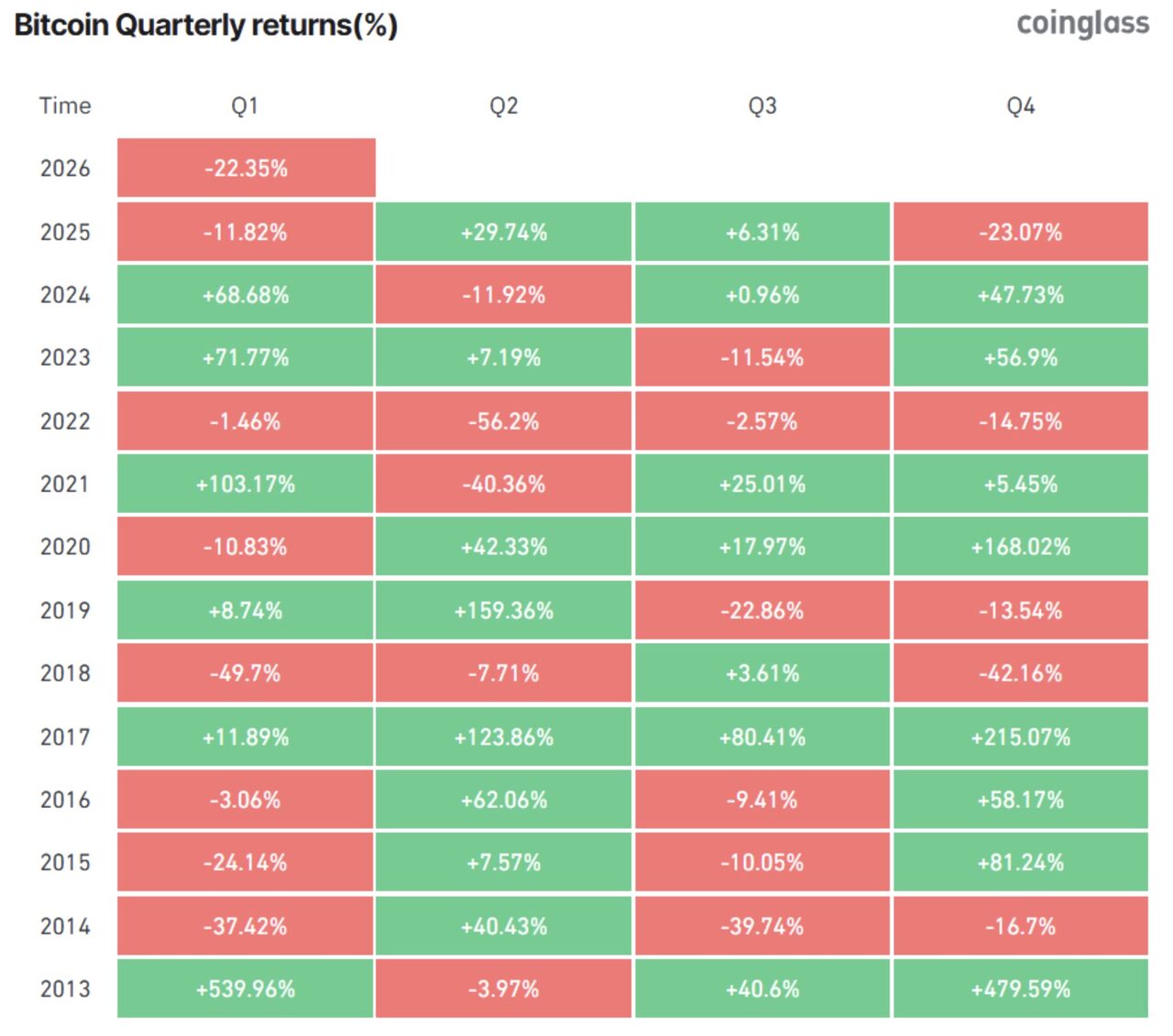Theo dữ liệu của Coinglass, đợt suy giảm nghiêm trọng nhất trong quý 1 xảy ra vào năm 2018, khi giá trị Bitcoin giảm gần 50%. Mặc dù chịu tổn thất nặng nề, Bitcoin sau đó đã bước vào một trong những giai đoạn phục hồi mạnh mẽ nhất.