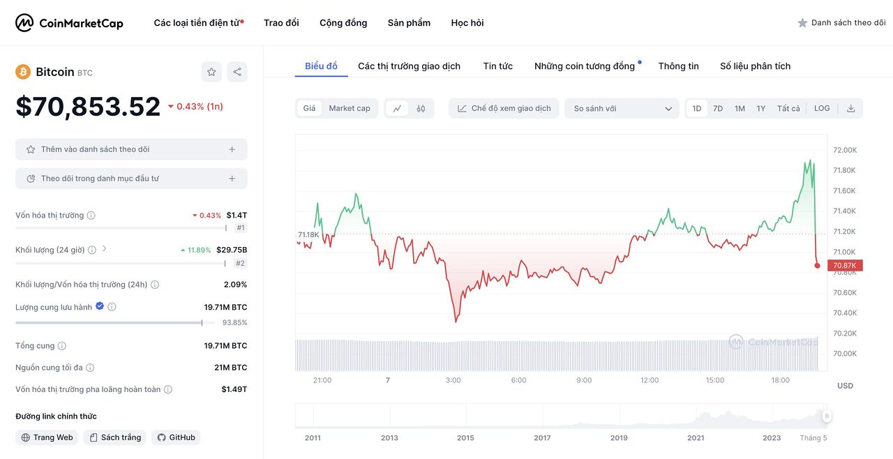 Tại thời điểm viết bài, Bitcoin đang giao dịch với giá 70.853,5 USD, ghi nhận mức giảm nhẹ 0,43% trong 24 giờ qua. Tuy nhiên, tài sản hàng đầu này lại chứng kiến khối lượng giao dịch hàng ngày tăng 11,89%.
