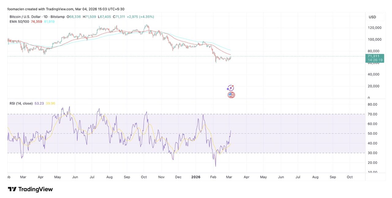 Tại thời điểm viết bài này, giá Bitcoin đang ở mức 71.169 đô la, giao dịch gần mức trên của kênh tích lũy và hiện đang cho thấy dấu hiệu thay đổi xu hướng