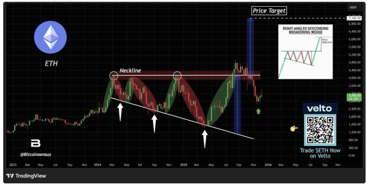 Để củng cố quan điểm này, một nhà phân tích khác, Bitcoinsensus, nhận thấy một mô hình biểu đồ tăng giá đang hình thành trên khung thời gian hàng ngày. Ông lưu ý rằng Ethereum đang hình thành một mô hình nêm mở rộng giảm dần vuông góc, một cấu trúc thường phá vỡ theo hướng đi lên. Dựa trên thiết lập này, ông tin rằng Ethereum có thể nhắm mục tiêu trước tiên là 5.000 đô la, và tiếp tục hướng tới 7.000 đô la nếu điều kiện thị trường vẫn mạnh mẽ.