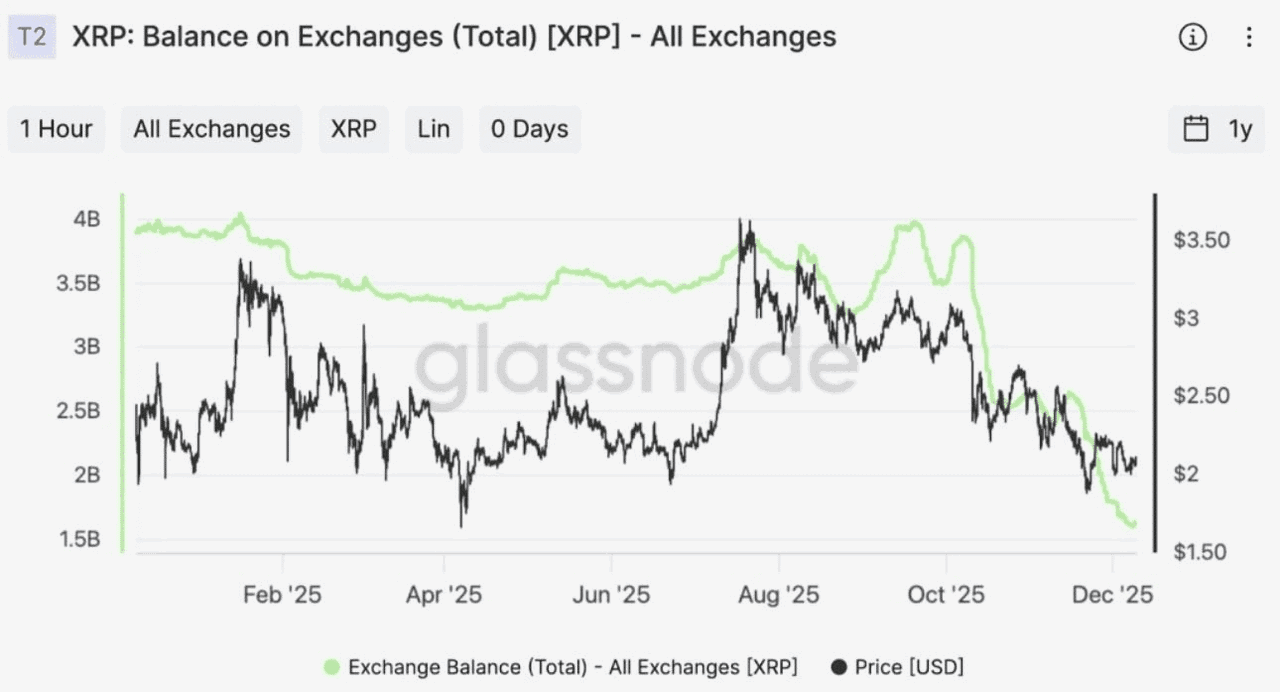Dữ liệu từ Glassnode cho thấy lượng XRP trên các sàn giao dịch đã giảm mạnh, từ khoảng 4 tỷ XRP đầu năm xuống còn gần 1,5 tỷ XRP hiện tại.