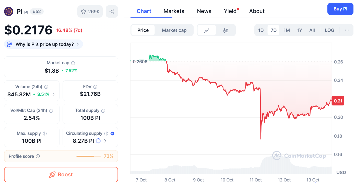 Trong khi phần lớn các altcoin sụt giảm mạnh vì căng thẳng thương mại Mỹ–Trung, Pi Coin vẫn giữ được mốc hỗ trợ quan trọng 0,15 USD, dù giảm 23% trong tuần qua.