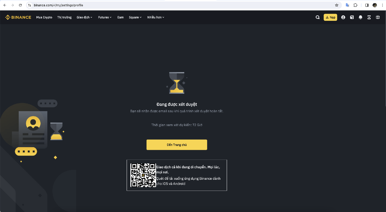 Sau khi hoàn thành các bước trên, hệ thống sẽ thông báo Giấy tờ đã được gửi. Lúc này bạn trở về trang web của Binance và chờ đợi kết quả.