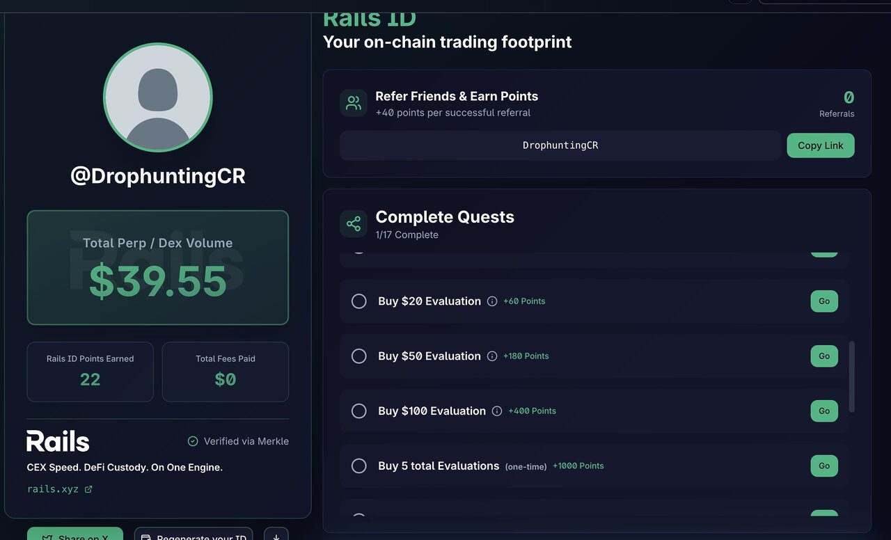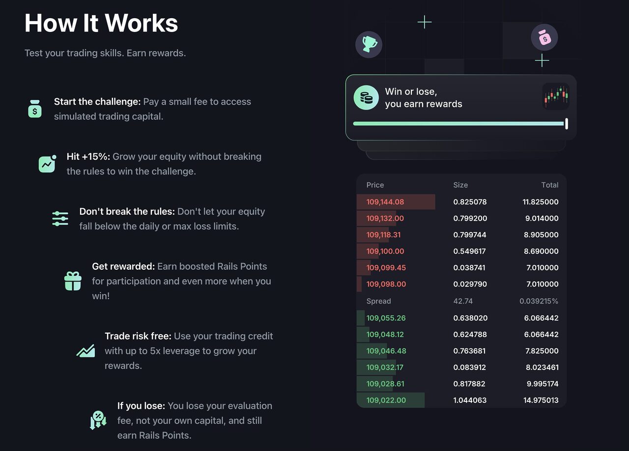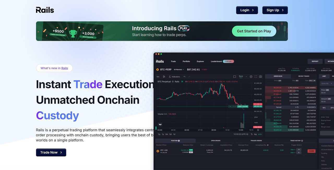 Rails là nền tảng giao dịch futures vĩnh cửu hybrid, kết hợp khớp lệnh tập trung và lưu ký on-chain, mang lại tốc độ dưới mili giây nhưng vẫn đảm bảo an toàn.