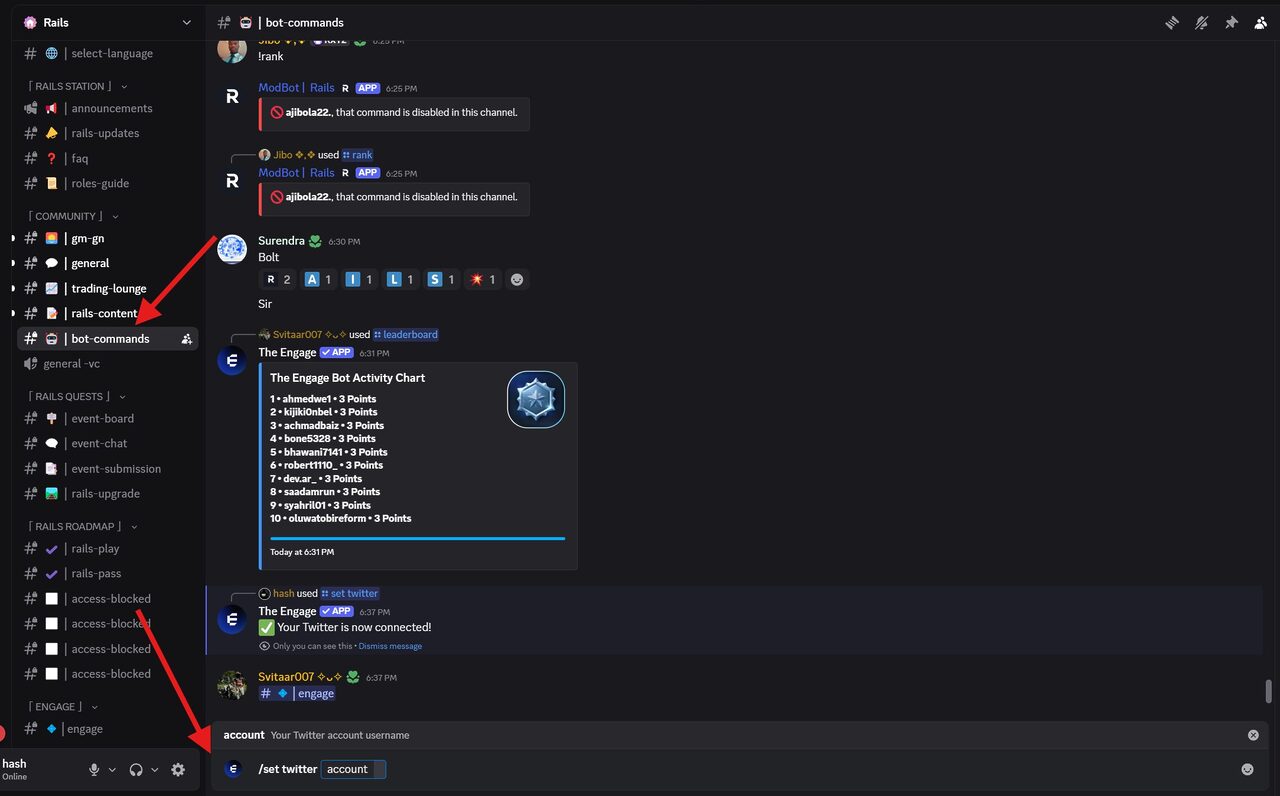 Bước 2: Vào kênh bot-commands -> nhập lệnh “/set twitter” rồi nhập tên người dùng của bạn. Bằng cách này, bot sẽ theo dõi tất cả số liệu thống kê của bạn.