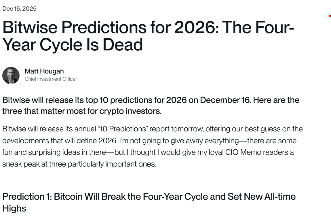 Điểm đáng chú ý là Bitwise tin rằng Bitcoin sẽ phá vỡ quy luật chu kỳ 4 năm truyền thống, vốn thường gồm ba năm tăng mạnh và một năm điều chỉnh sâu.